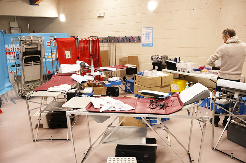 Habib est vite rejoint par Coraline, chargée d’accueil, et par les infirmiers Hajar, Julian et Xavier, qui l’aident à finaliser l’installation des lieux. A chaque collecte c’est le même ballet bien rodé : il faut transformer la salle polyvalente en un point de collecte opérationnel, médicalisé et accueillant pour les donneurs. Chacun connaît sa tâche, son matériel, et les lieux leur sont familiers puisque les collectes sur site sont régulières.