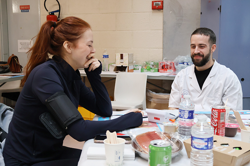 Alors que Sullivan, L’Haÿssien de 31 ans, demande une seconde compote à Habib (« autant que vous voulez », répond Habib), nous retrouvons Chloé : « Tout s’est très bien passé, mais je dois tout de même attendre 24 heures pour faire du sport parce que, suite au prélèvement, j’ai moins de globules rouges pour transporter l’oxygène vers les organes, mais ce n’est pas grave, c’est pour la bonne cause, et les globules vont se reformer très vite. »