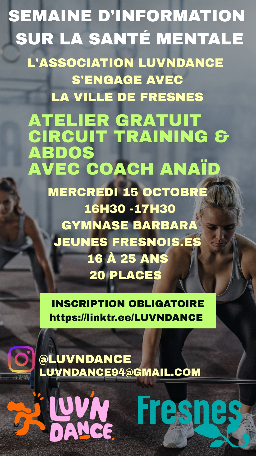 Dans le cadre de cette semaine, l’association LUVNDANCE en partenariat avec la Ville de Fresnes organise un atelier gratuit Circuit Training & Abdos animé par Coach Anaïd, qui vous coachera avec énergie et bienveillance