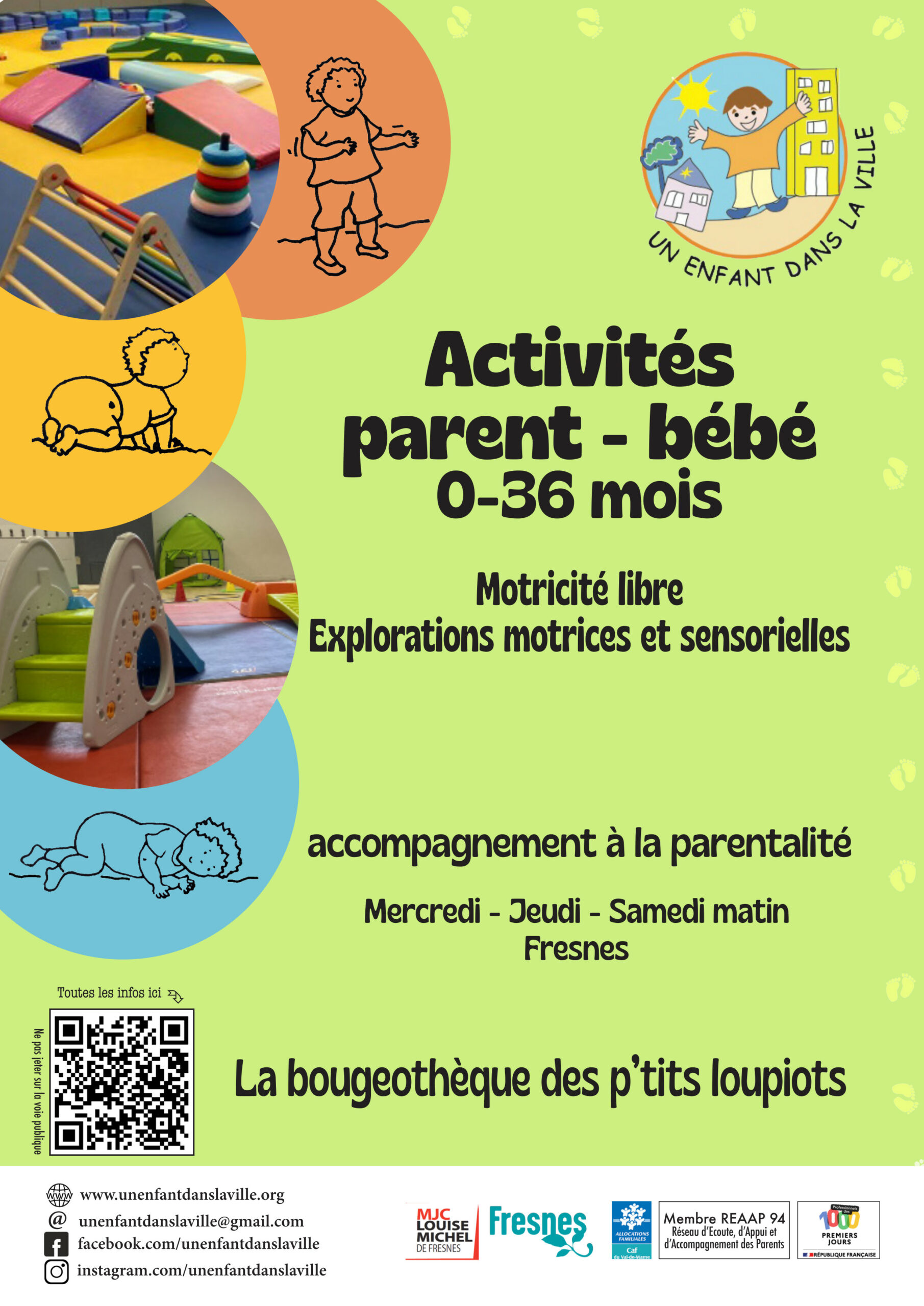 Du matériel pour les plus grands (18-30 mois) est présent pour grimper, glisser, se balancer, tester son équilibre… élaborer des jeux de construction avec des jeux de manipulation, toujours dans l’esprit de laisser l’enfant expérimenter et trouver ses solutions, en autonomie et en sécurité. C’est aussi un lieu de rencontre et d’échanges avec d’autres parents et des professionnelles. Vous pourrez y trouver une écoute autour de vos questionnements de parents.