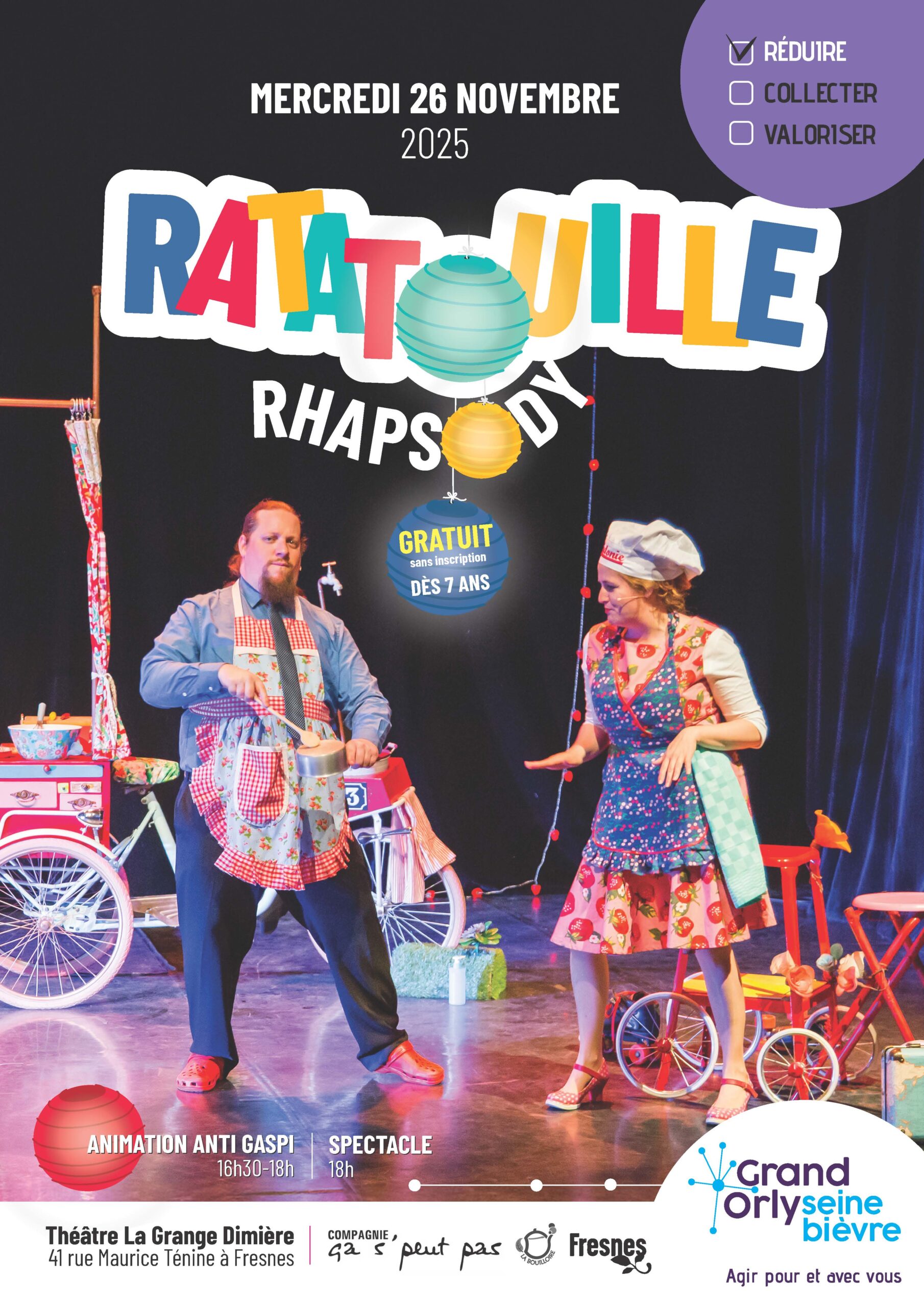 Spectacle familial et participatif qui aborde avec humour et en musique le thème du gaspillage alimentaire. L’occasion également de parler consommation responsable, de saison et de proximité.